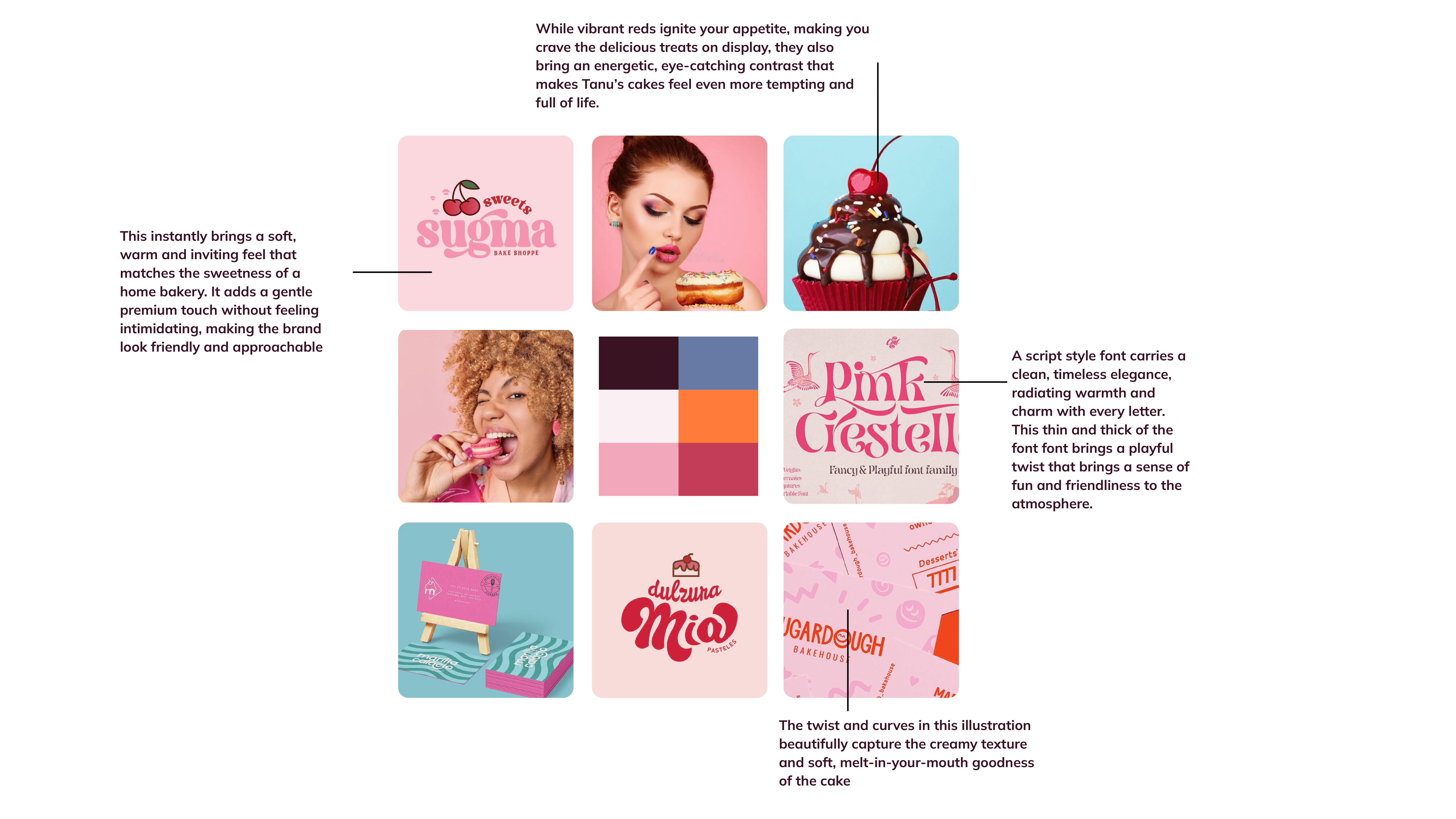 The visual assets are inspired by the way cream flows smoothly from a piping cone onto a cake. I wanted the illustrations of the cake, muffin and bun to feel the same way — like a single continuous line that starts, curves and forms the shape. That uninterrupted stroke reflects the joy of baking, the ease of Tanu’s craft, and the idea that we’re all connected through little moments of sweetness and happiness her bakes bring.